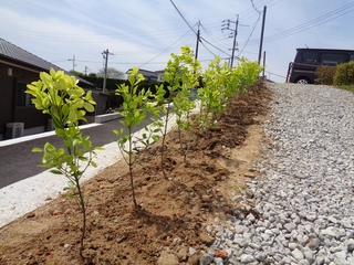 第一駐車場からサッカー場に上がる坂道にオウゴンマサキの苗を植えました。