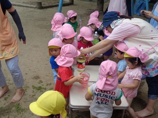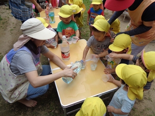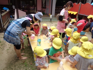 ゆりぐみさんとももぐみさんは園庭で色水遊びを楽しんでいます。