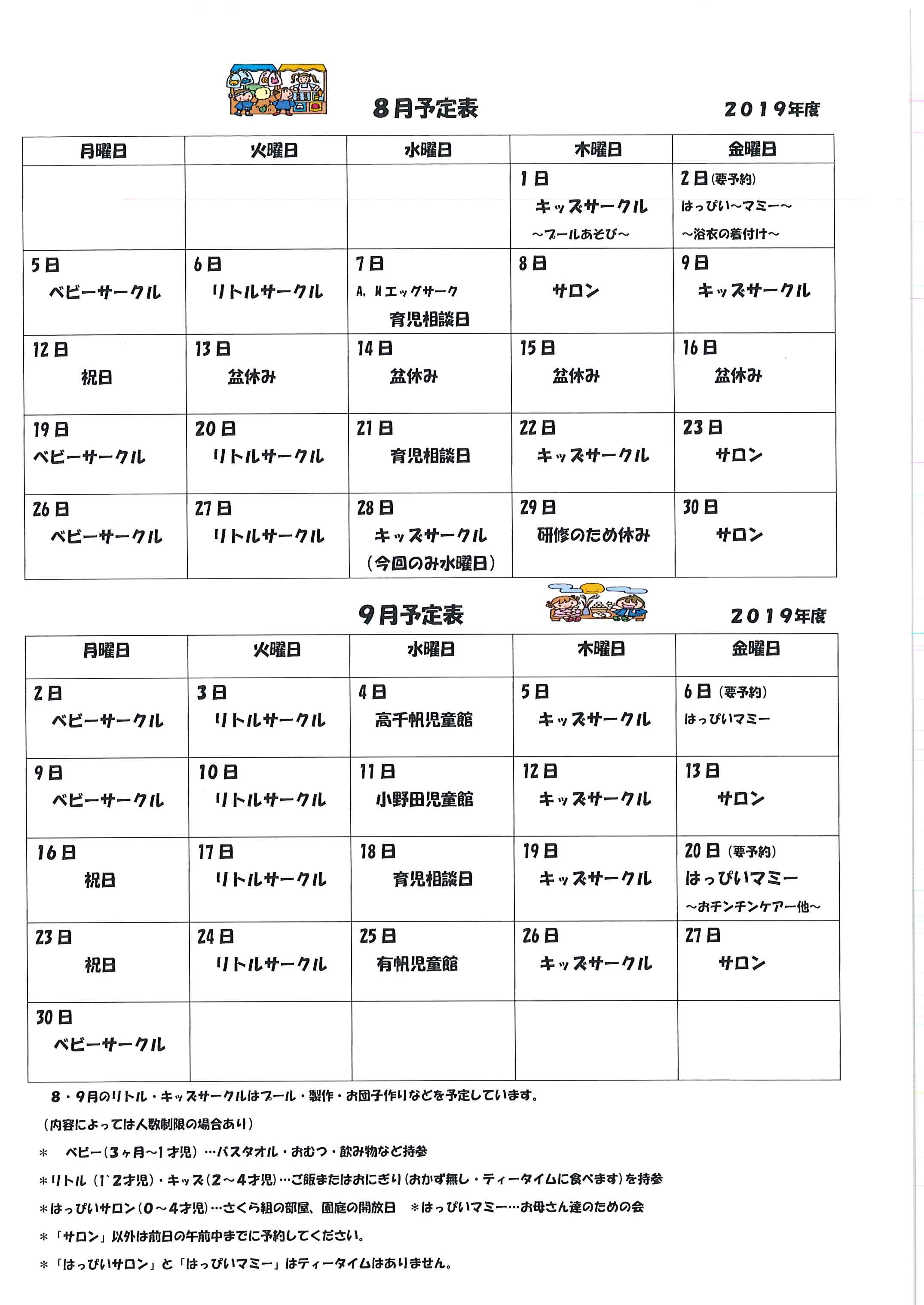 2019年8月と9月の子育て支援センターはっぴぃさくらぐみのスケジュールを公開しました。