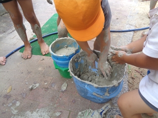 乾いてパリパリになってきたのも楽しいようで、「終わった人洗うからおいで~」の声をあえて無視するように粘土をかき混ぜて自分の足に塗りたくっています。よほど楽しかったのかもしれません。