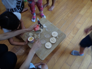 歌に合わせて順番にミルクの缶を振ってアイスが出来るように冷やしていきます。