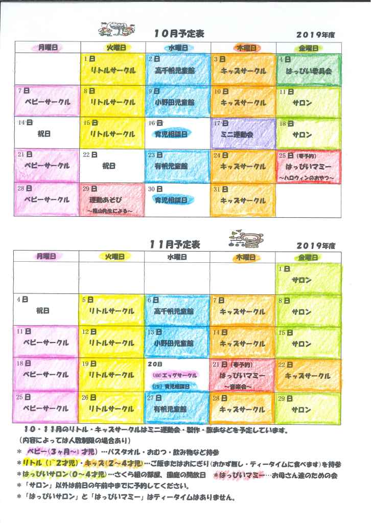 2019年10月と11月の子育て支援センターはっぴぃさくらぐみのスケジュールを公開しました。