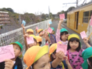 すみれグループの子どもたちが植樹祭で食べるお菓子を買うために、電車に乗っていきました。