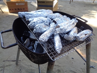 園庭にコンロを用意し、炭火でじっくりと焼き上げます。