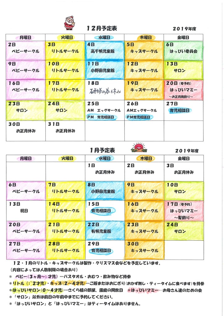 2019年12月と2020年1月の子育て支援センターはっぴぃさくらぐみのスケジュールを公開しました。