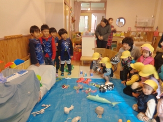 めったに来ることがないほしぐみのお部屋に少々緊張しつつも、水族館やお菓子屋さんの店頭でじーっと興味深そうに眺めています。