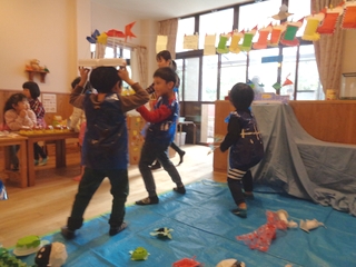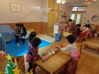 ”おふざけ”とも言えそうな瞬間ですが、お店屋さんにも息抜きは必要です。子どもたちが長時間同じことをし続けることは難しいことですが、一瞬でも気分転換をすれば、長時間集中出来ることもあります。