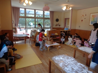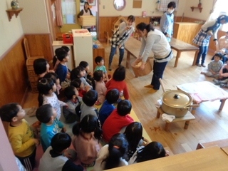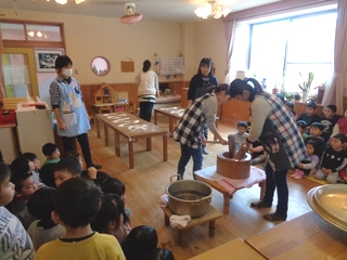 つきぐみ・ほしぐみの子どもたちがお餅つきを楽しみました。