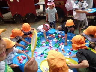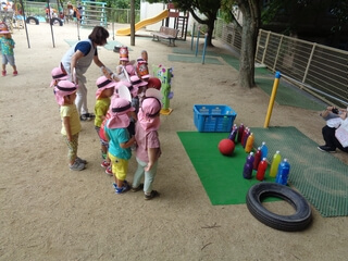 園庭ではボーリングや金魚すくいなどのゲームコーナーがたくさんでて、子どもたちはグループで思い思いに楽しみます。