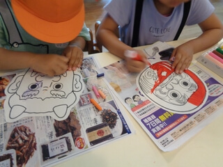 室内でも自作のお面を作って頭にかぶって、お祭り気分が高まります。