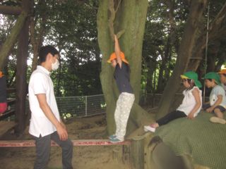 その様子を見ていた下の子達も、ジャンプして掴むことは出来ないけど、ツルから大人の支え無しで飛び降りたり、ツルを掴んで長い時間ぶら下がってみたりと、思い思いに自分の「やってみたい」を試しているようで、あっという間に時間が流れていきました。