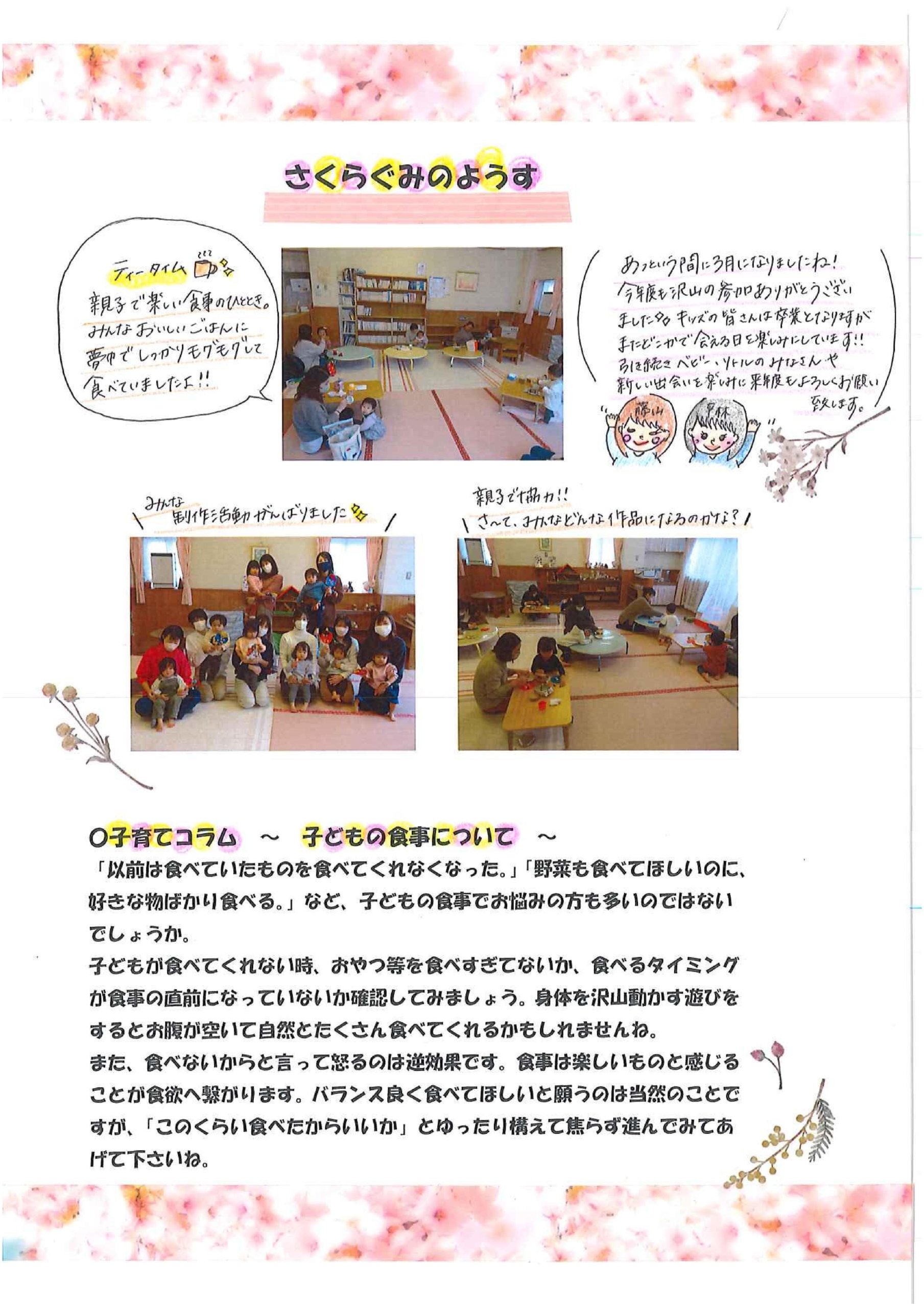1. […] 寒さの中にも、少しずつ春の暖かい日差しが感じられるようになってきましたね。 今年度も残りわずかになりましたが、最後までさくら組の子どもたちと楽しい毎日にしていきたいと思いますのでよろしくお願いします。 202303スケジ […] Read More […]
