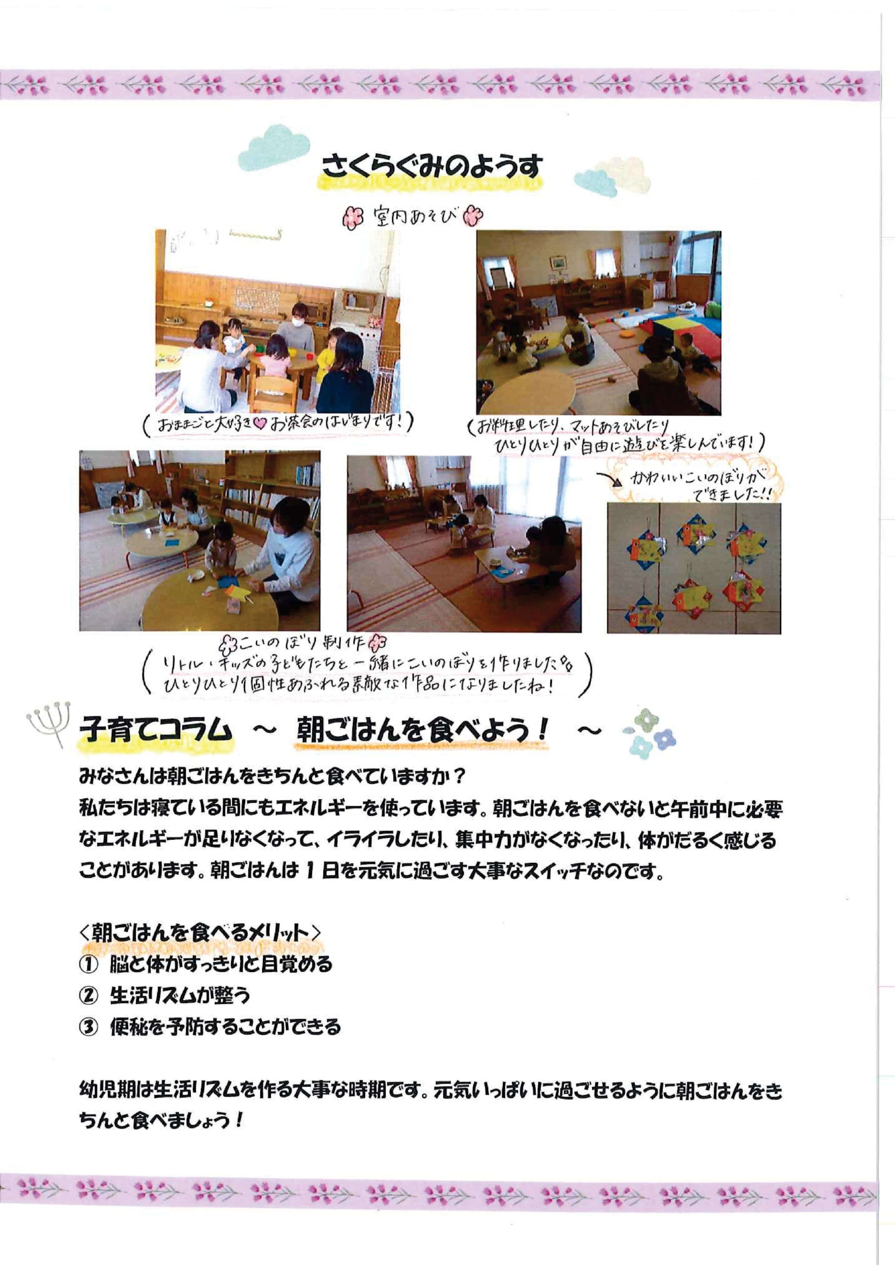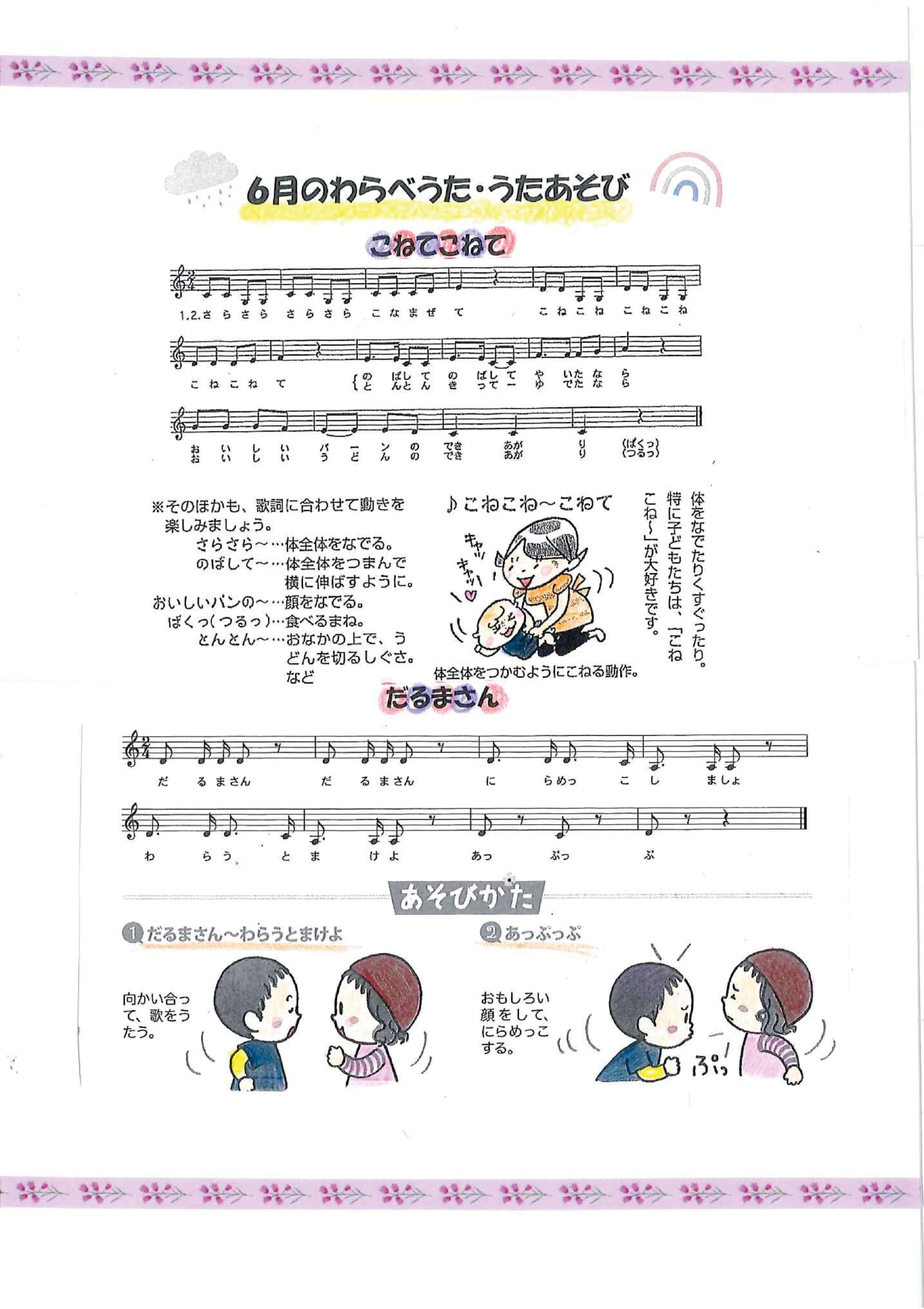 晴れたり雨が降ったり、天気の移り変わりが多い時期になってきましたね。 室内や戸外に関係なく、子どもたちは日々色々な遊びを楽しんでいます。 今月も親子で楽しんで過ごしていけたらと思います。