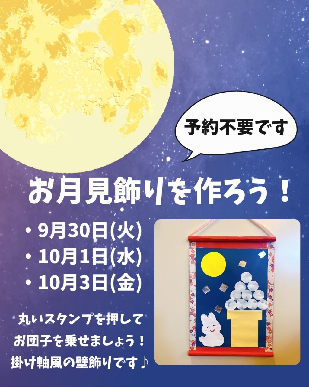 9月30日、10月1日、10月3日お月見飾り作りを行います。掛け軸風の壁飾りを作って、お子さんといっしょにお月見気分を味わいましょう。