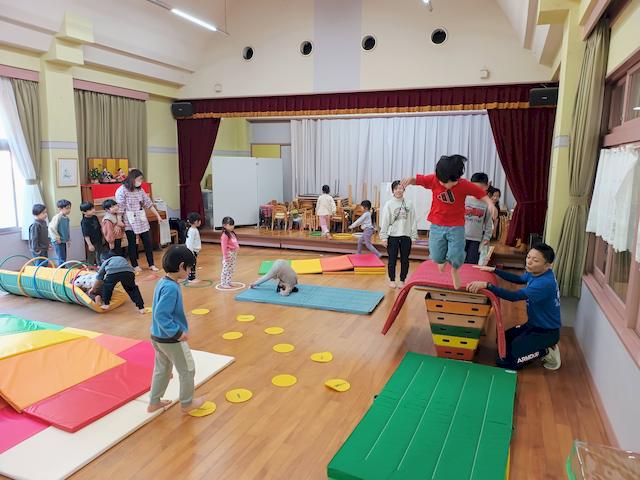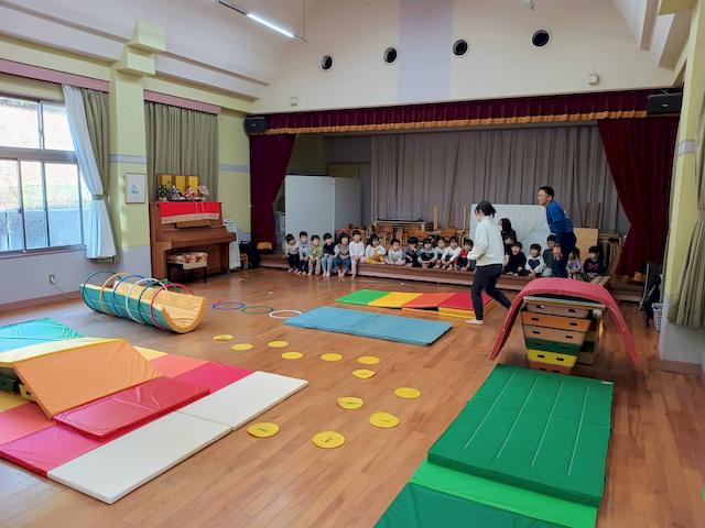 今回はホールにマットや跳び箱、平均台など園にある色々なものを並べてサーキット遊びです。子どもたちは準備の段階からワクワクしていました。