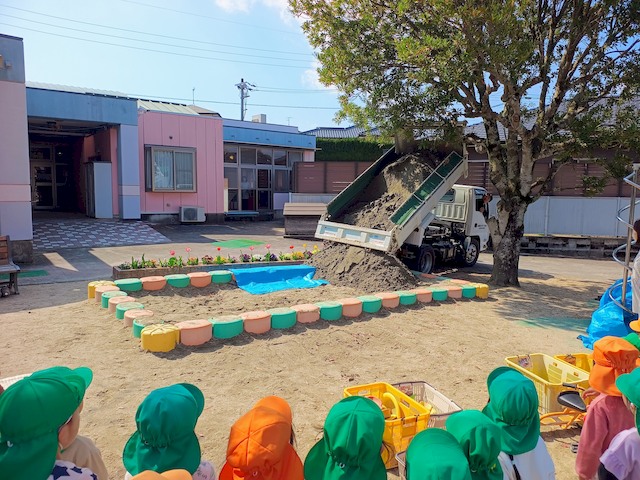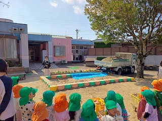 園庭に砂を積んだダンプカーが入ってくると、こどもたちは何事か?と集まります。