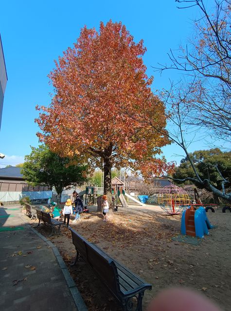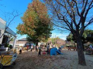 秋には落ち葉やドングリが園庭の至る所に落ちているので、様々な遊び方が広がります。