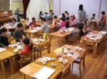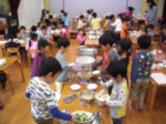 3・4・5歳の幼児の給食はランチルームで行い、3年齢の子ども4~5人が1つのテーブルを囲みます。4歳・5歳は自分で食べきれる量を自分で盛り付けるバイキング形式としています。